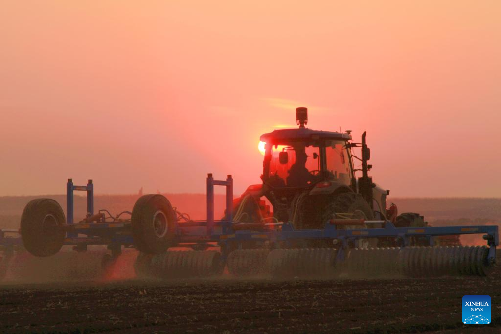 A worker of the Beidahuang Group performs post-sowing operations on a tractor in a soybean field of northeast China's Heilongjiang Province, May 7, 2025. At present, the spring sowing in Heilongjiang cultivation areas are in full swing. All agricultural production units of Beidahuang Group, one of China's leading agricultural conglomerates, are seizing the farming season and busy with the sowing operations in both paddy rice fields and dry fields. (Photo by Lin Jinchun/Xinhua)