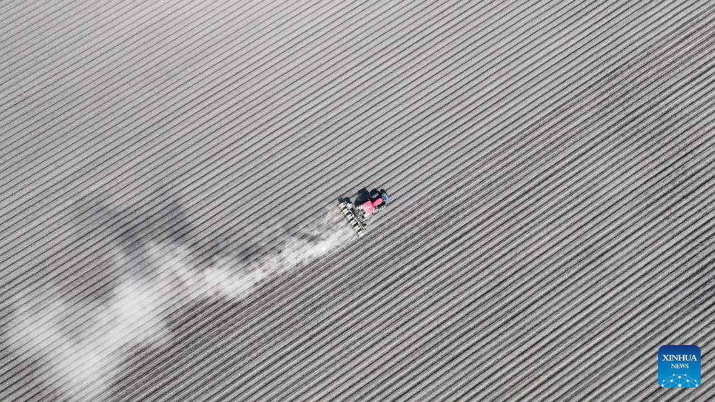 A drone photo taken on May 8, 2025 shows an agricultural machine conducting soil treatment in a field of a farming company under Beidahuang Group in northeast China's Heilongjiang Province. At present, the spring sowing in Heilongjiang cultivation areas are in full swing. All agricultural production units of Beidahuang Group, one of China's leading agricultural conglomerates, are seizing the farming season and busy with the sowing operations in both paddy rice fields and dry fields. (Photo by Xu Yingxian/Xinhua)