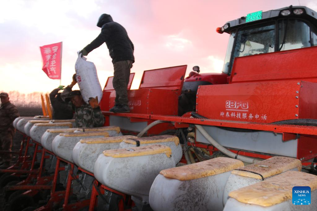 Workers load soybean seeds and fertilizers at sunset in a field of a farming company under Beidahuang Group in northeast China's Heilongjiang Province, May 7, 2025. At present, the spring sowing in Heilongjiang cultivation areas are in full swing. All agricultural production units of Beidahuang Group, one of China's leading agricultural conglomerates, are seizing the farming season and busy with the sowing operations in both paddy rice fields and dry fields. (Photo by Lu Wenxiang/Xinhua)