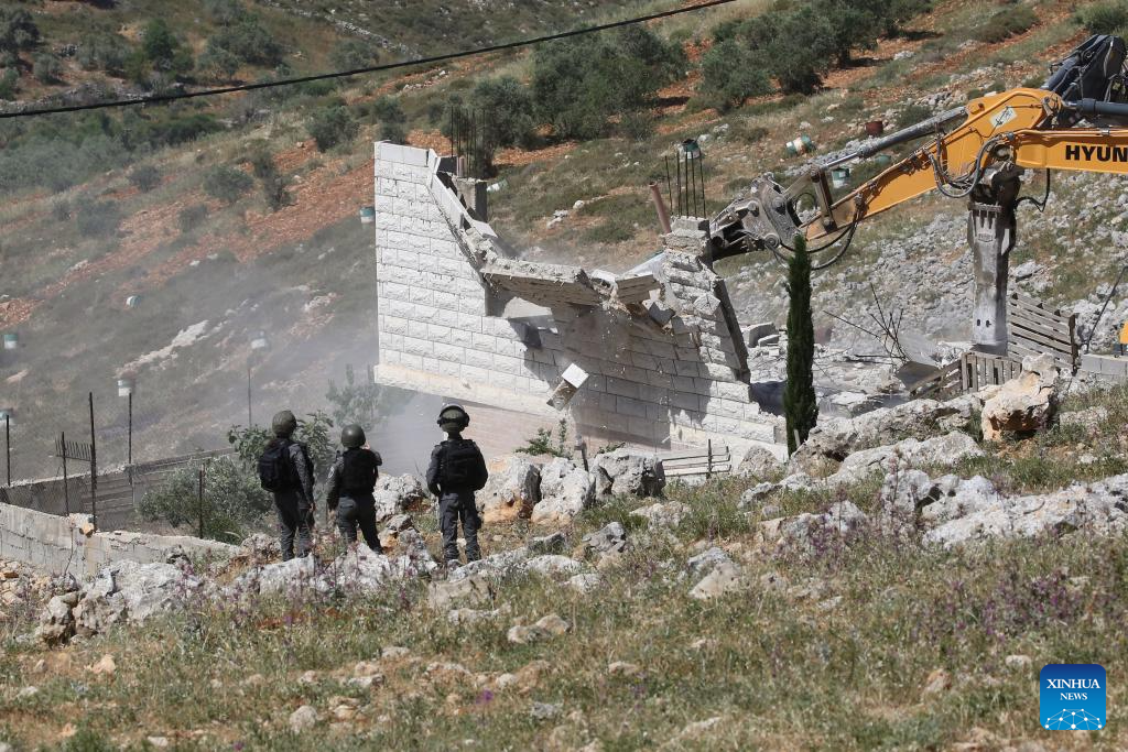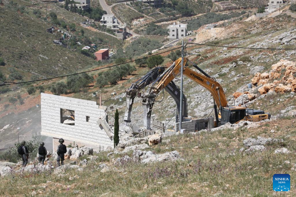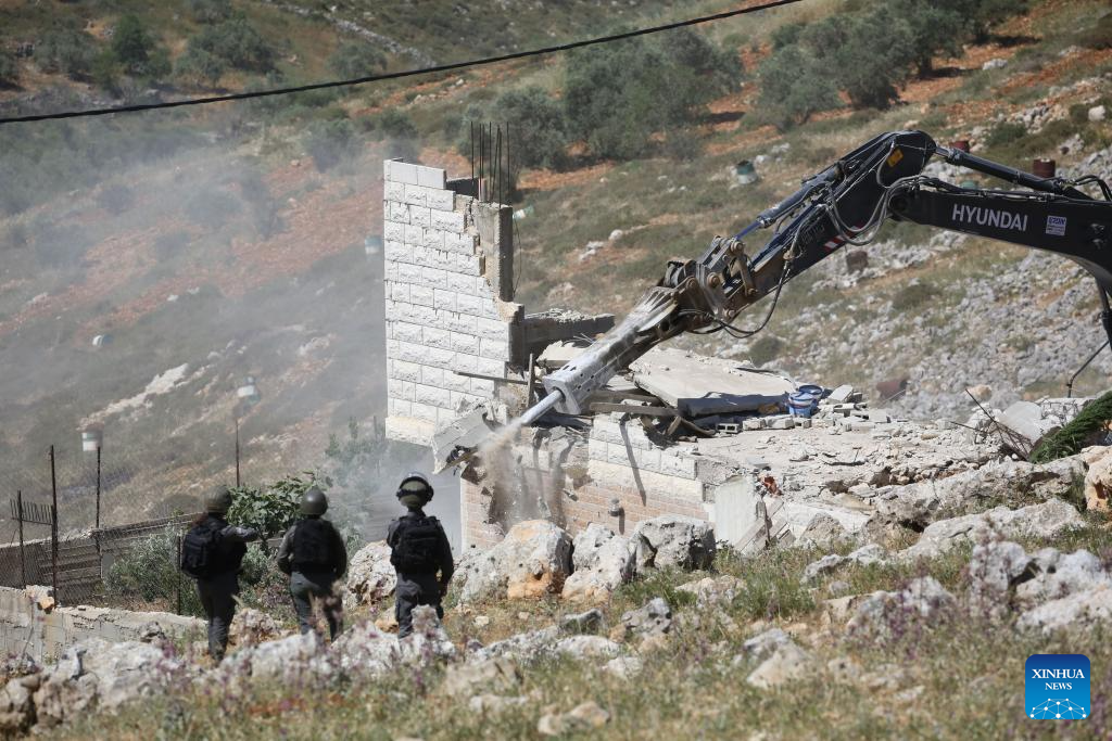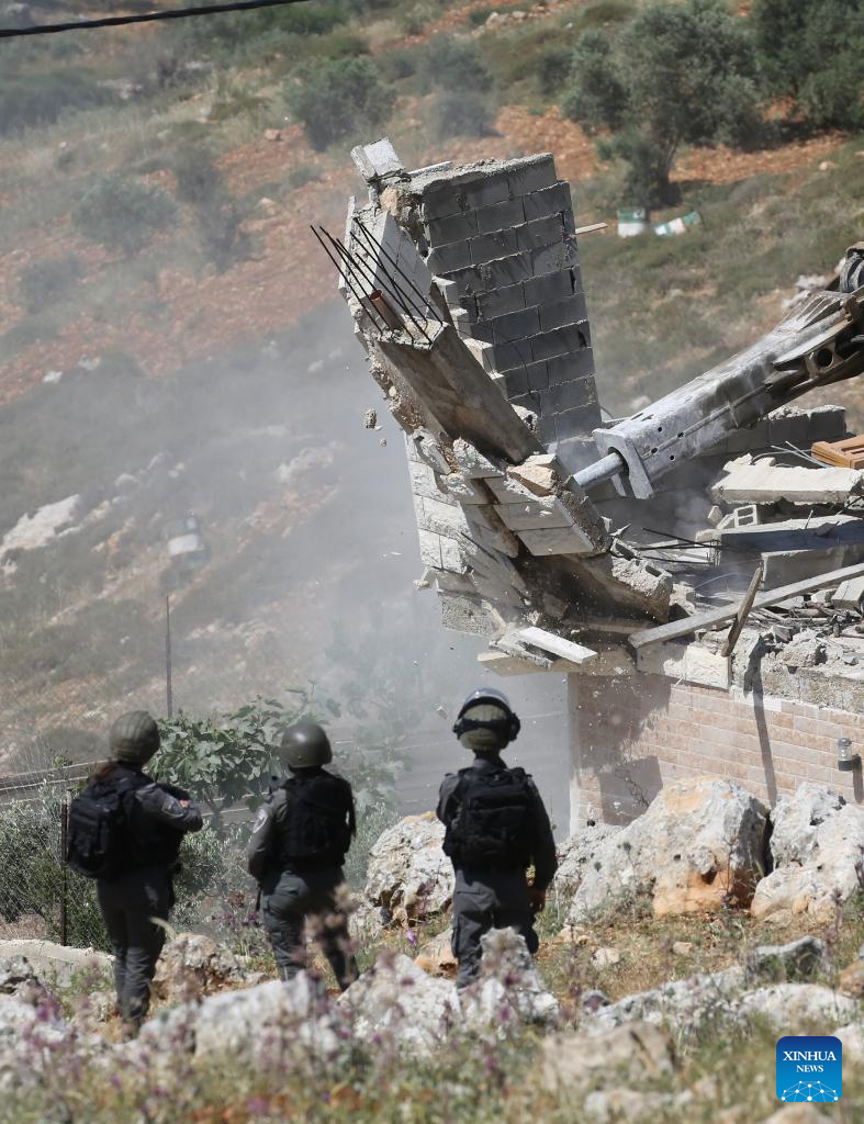 Israeli forces are seen as Israeli excavators demolish a Palestinian house, in the West Bank city of Nablus, on May 8, 2025. (Photo by Nidal Eshtayeh/Xinhua)