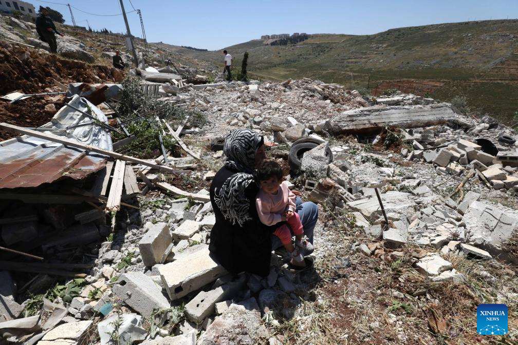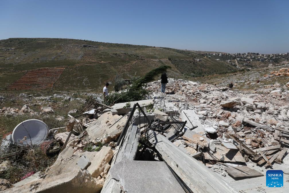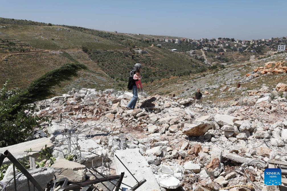 Palestinians are seen at the site of a destroyed house after Israeli excavators demolished it, in the West Bank city of Nablus, on May 8, 2025. (Photo by Nidal Eshtayeh/Xinhua)