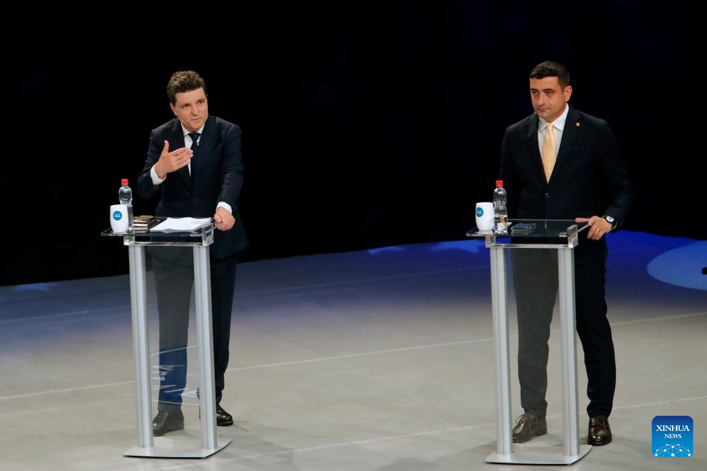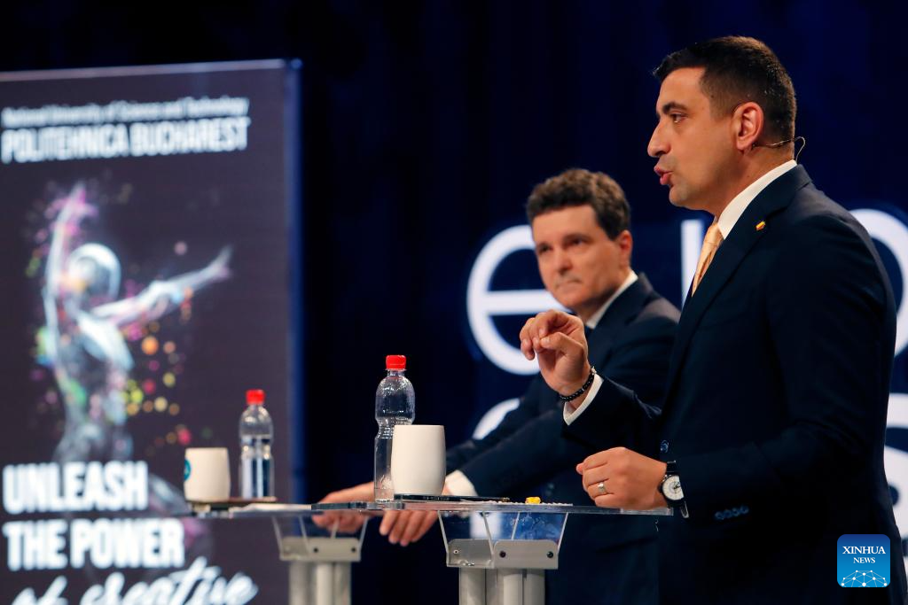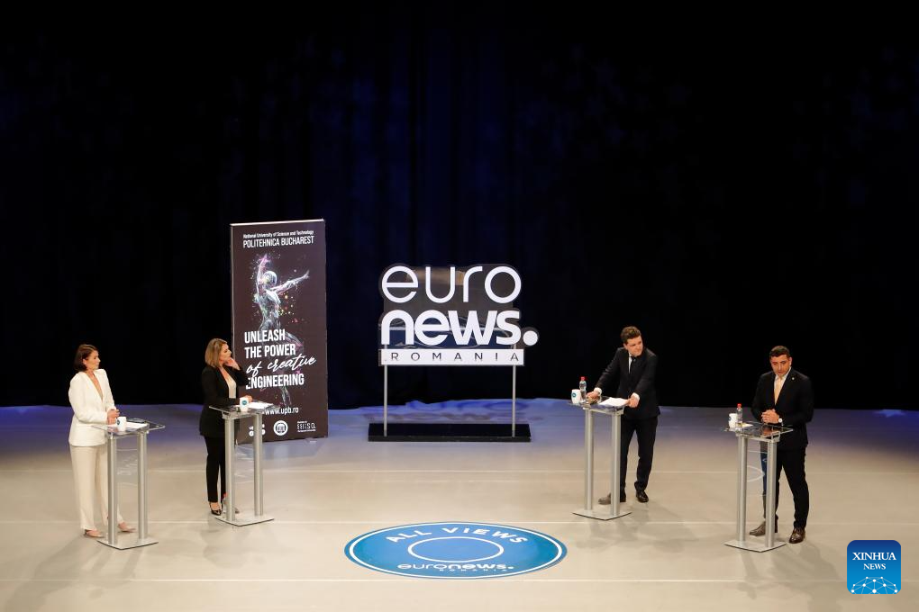 George Simion (1st R), chairman of the Alliance for the Union of Romanians, and Bucharest Mayor Nicusor Dan (2nd R) attend a TV debate in Bucharest, Romania, May 8, 2025. George Simion and Nicusor Dan will advance to the runoff of Romania's presidential election rerun, scheduled for May 18. (Photo by Cristian Cristel/Xinhua)