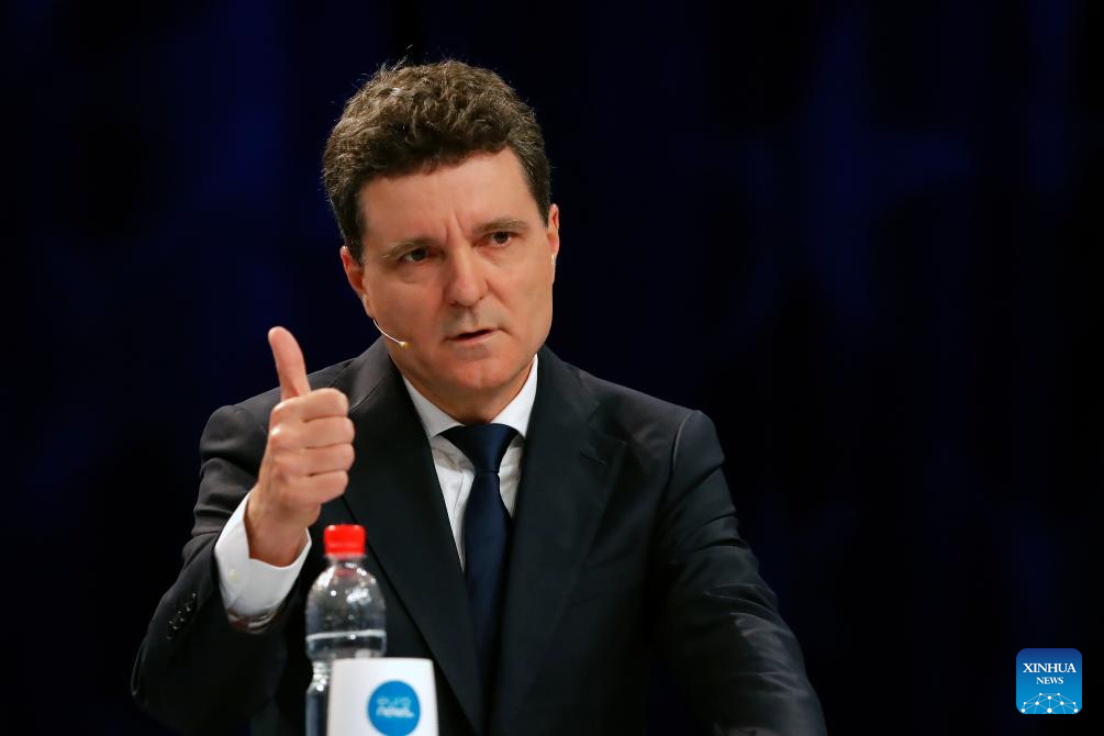 Bucharest Mayor Nicusor Dan gestures during a TV debate with George Simion (not in picture), chairman of the Alliance for the Union of Romanians, in Bucharest, Romania, May 8, 2025. George Simion and Nicusor Dan will advance to the runoff of Romania's presidential election rerun, scheduled for May 18. (Photo by Cristian Cristel/Xinhua)