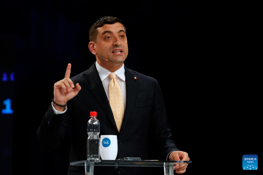 George Simion, chairman of the Alliance for the Union of Romanians, gestures during a TV debate with Bucharest Mayor Nicusor Dan (not in picture) in Bucharest, Romania, May 8, 2025. George Simion and Nicusor Dan will advance to the runoff of Romania's presidential election rerun, scheduled for May 18. (Photo by Cristian Cristel/Xinhua)