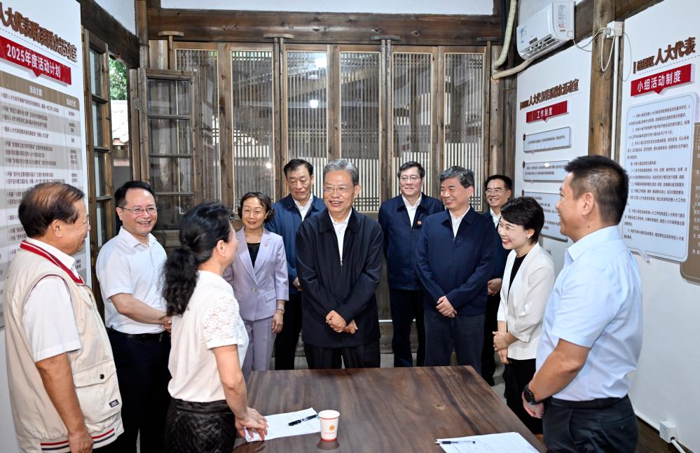 Zhao Leji, chairman of the National People's Congress Standing Committee and a member of the Standing Committee of the Political Bureau of the Communist Party of China Central Committee, interacts with local lawmakers and members of the public in Gulou District of Fuzhou City, southeast China's Fujian Province, May 8, 2025. Zhao conducted an inspection and research tour in Fujian from Wednesday to Friday this week. (Xinhua/Yin Bogu)