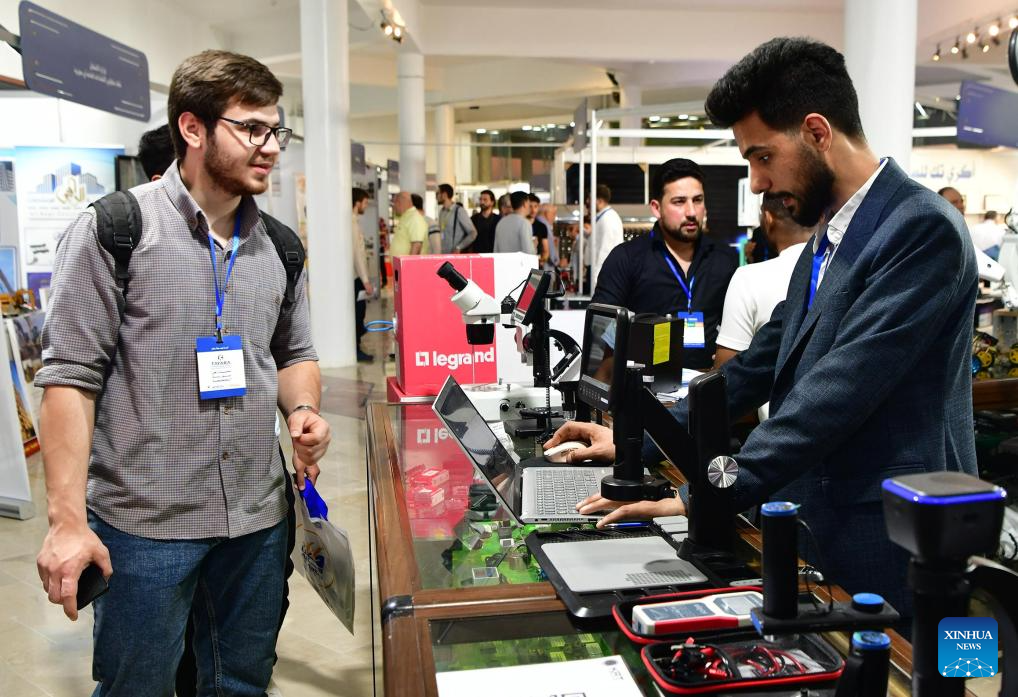 People visit the Syria Energy Expo, a specialized exhibition focused on electricity and energy technologies, at the new Exhibition City grounds in Damascus, Syria, May 8, 2025. The event featuring over 500 local and international companies is part of a broader series of trade fairs. (Photo by Ammar Safarjalani/Xinhua)