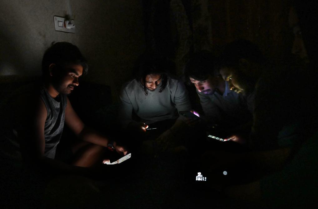 People watch their mobile phones in a room during a blackout enforced by authorities in Srinagar city, Indian-controlled Kashmir, on may 9, 2025. Tensions have remained as flare-ups between Pakistan and India have entered the third day. (Xinhua/Javed Dar)