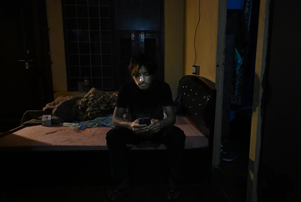 A man watches a mobile phone in a room during a blackout enforced by authorities in Srinagar city, Indian-controlled Kashmir, on may 9, 2025. Tensions have remained as flare-ups between Pakistan and India have entered the third day. (Xinhua/Javed Dar)