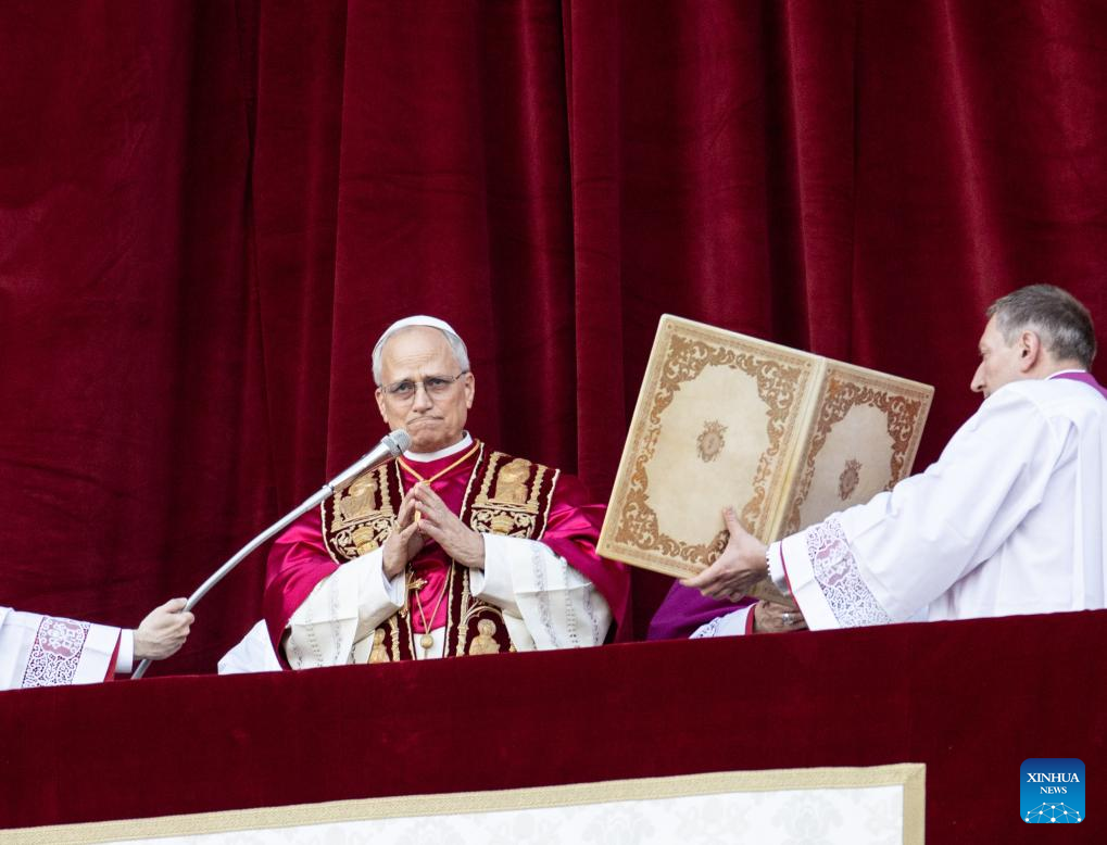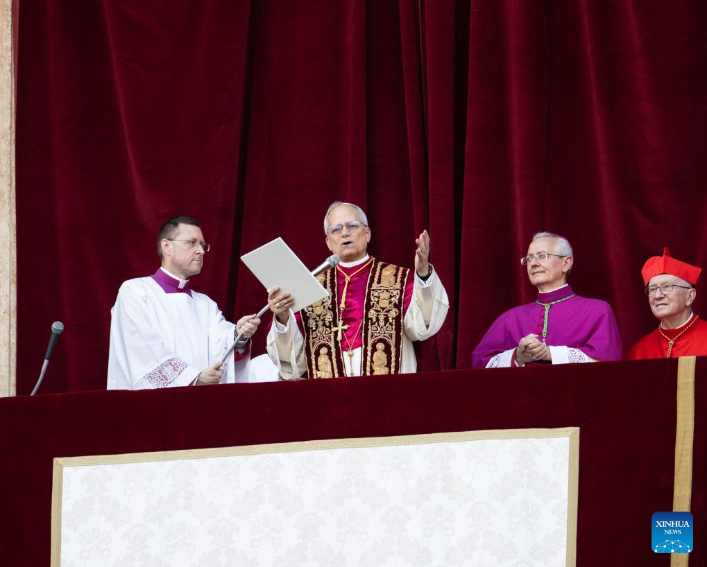 Robert Francis Prevost (2nd L) addresses the crowd after being elected the new pope in Vatican City, on May 8, 2025. Robert Francis Prevost, the cardinal of the United States, was elected the new pope on the second day of secret ballots in the cardinals' conclave held in Vatican City. The name he chose as the new pope was Leo XIV. (Xinhua/Li Jing)