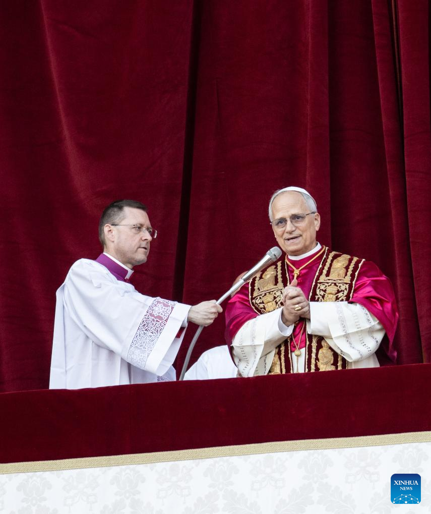 Robert Francis Prevost (L) addresses the crowd after being elected the new pope in Vatican City, on May 8, 2025. Robert Francis Prevost, the cardinal of the United States, was elected the new pope on the second day of secret ballots in the cardinals' conclave held in Vatican City. The name he chose as the new pope was Leo XIV. (Xinhua/Li Jing)