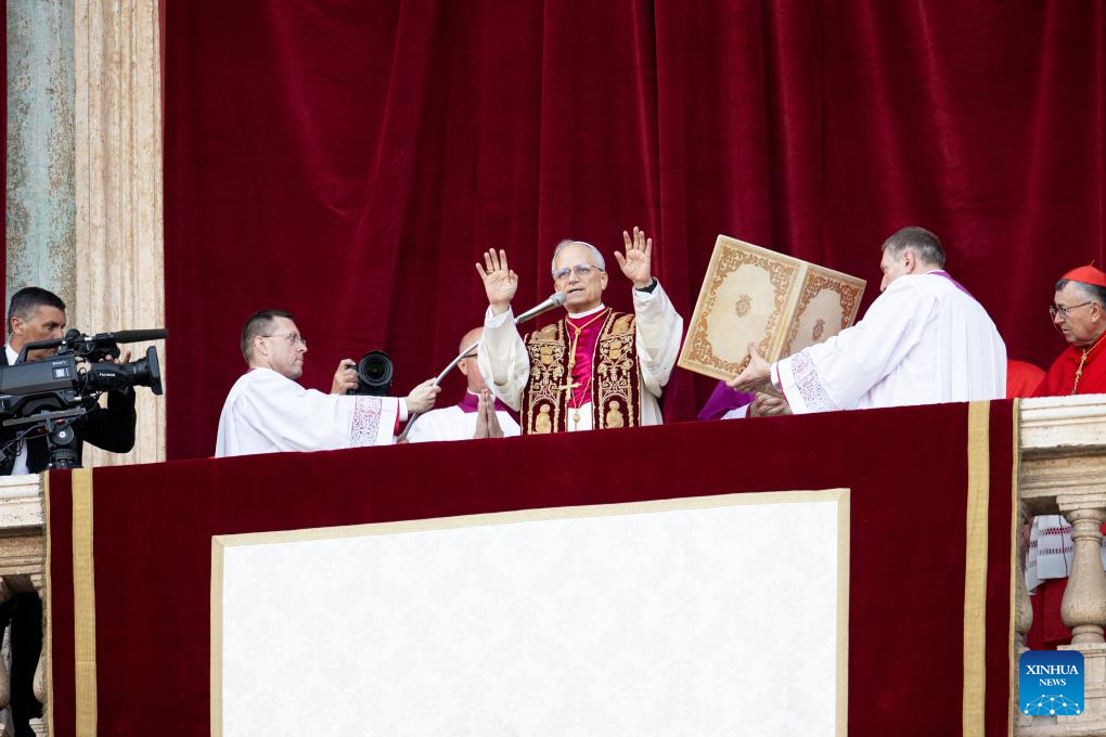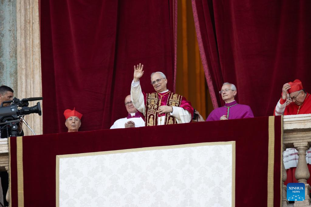 Robert Francis Prevost (C) waves to the crowd after being elected the new pope in Vatican City, on May 8, 2025. Robert Francis Prevost, the cardinal of the United States, was elected the new pope on the second day of secret ballots in the cardinals' conclave held in Vatican City. The name he chose as the new pope was Leo XIV. (Xinhua/Li Jing)