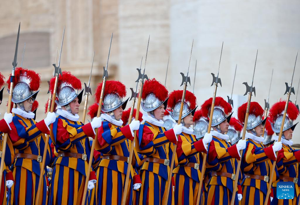 Swiss guards gather at St. Peter's Square in Vatican City, on May 8, 2025. Robert Francis Prevost, the cardinal of the United States, was elected the new pope on the second day of secret ballots in the cardinals' conclave held in Vatican City. The name he chose as the new pope was Leo XIV. (Xinhua/Li Jing)
