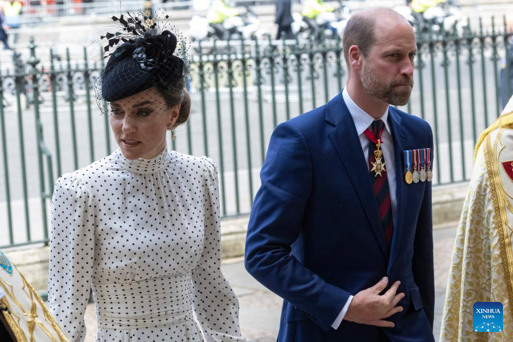 Britain's Prince William (R) and Catherine, Princess of Wales, arrive at Westminster Abbey to attend a service of thanksgiving to mark the 80th anniversary of VE Day, or Victory in Europe Day, in London, Britain, May 8, 2025. (Xinhua)