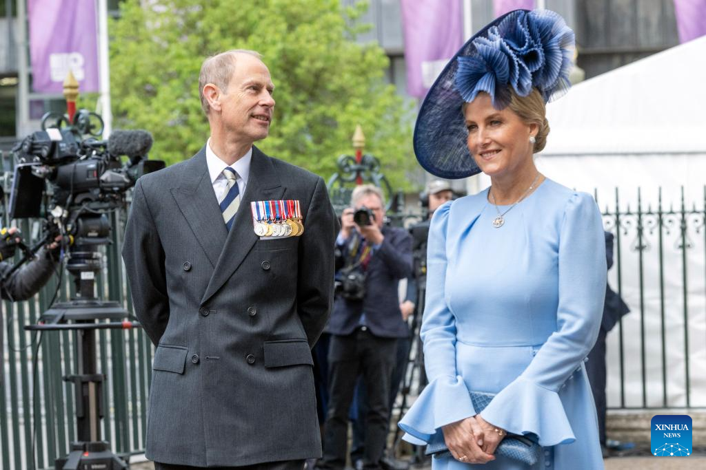 Britain's Prince Edward (L) and his wife Sophie, Duchess of Edinburgh, leave Westminster Abbey following a service of thanksgiving to mark the 80th anniversary of VE Day, or Victory in Europe Day, in London, Britain, May 8, 2025. (Xinhua)