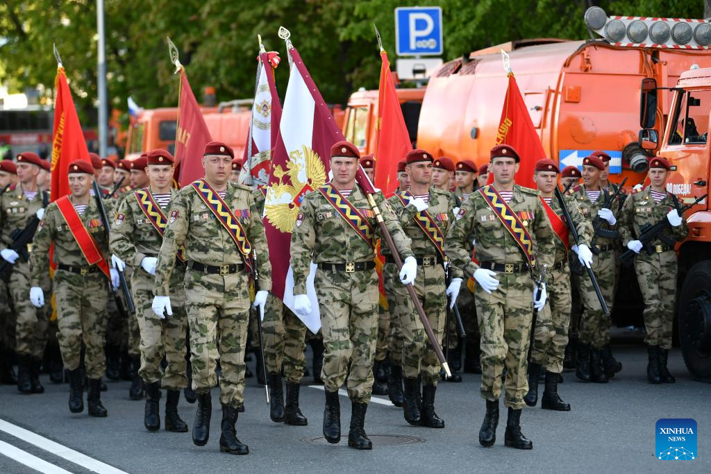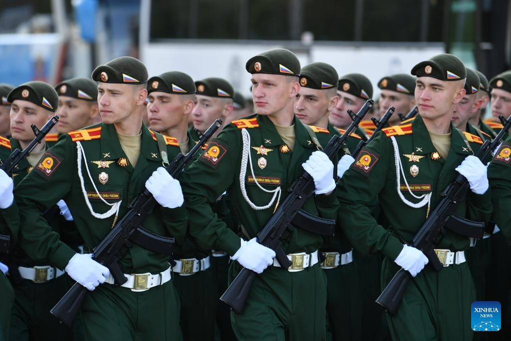 Military personnel are about to attend a military parade marking the 80th anniversary of the victory in the Soviet Union's Great Patriotic War in Moscow, Russia, May 9, 2025. (Xinhua/Bai Xueqi)