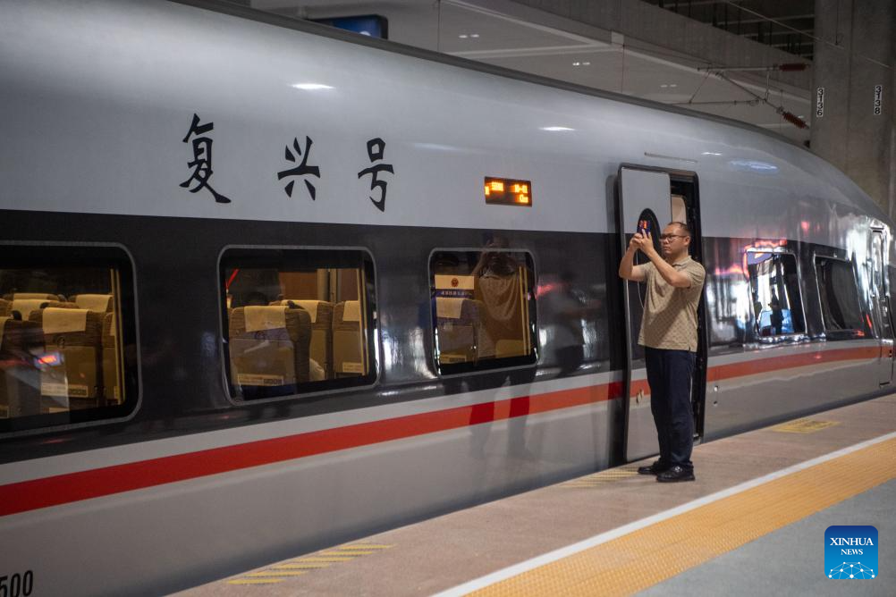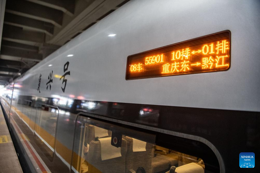 The high-speed test train departs from Chongqing East Railway Station in southwest China's Chongqing Municipality, May 9, 2025. With the departure of the high-speed test train from Chongqing East Railway Station, the joint debugging and test of Chongqing section of the newly-built Chongqing-Xiamen high-speed railway were successfully completed and started its test operation on Friday. (Xinhua/Tang Yi)