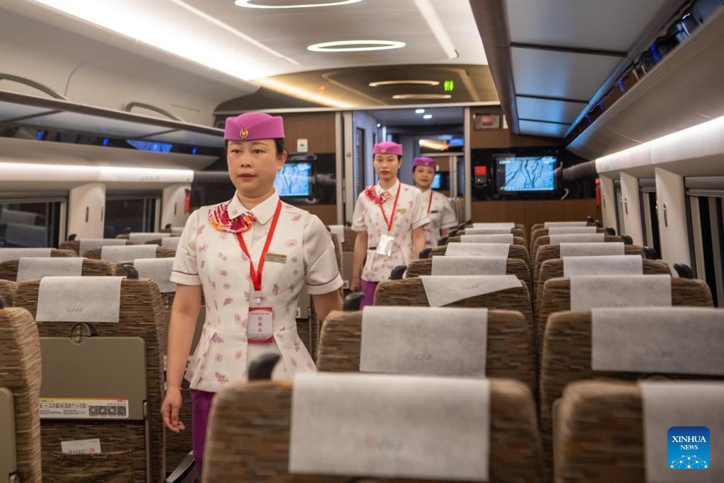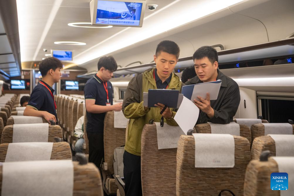 Railway staff wait for the departure inside the high-speed test train in southwest China's Chongqing Municipality, May 9, 2025. With the departure of the high-speed test train from Chongqing East Railway Station, the joint debugging and test of Chongqing section of the newly-built Chongqing-Xiamen high-speed railway were successfully completed and started its test operation on Friday. (Xinhua/Tang Yi)