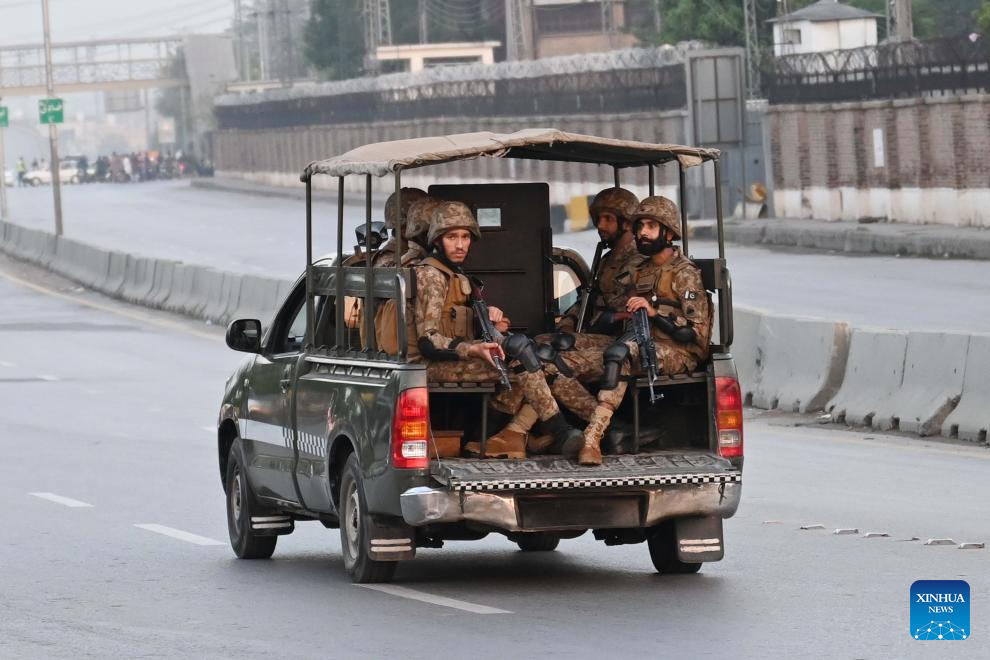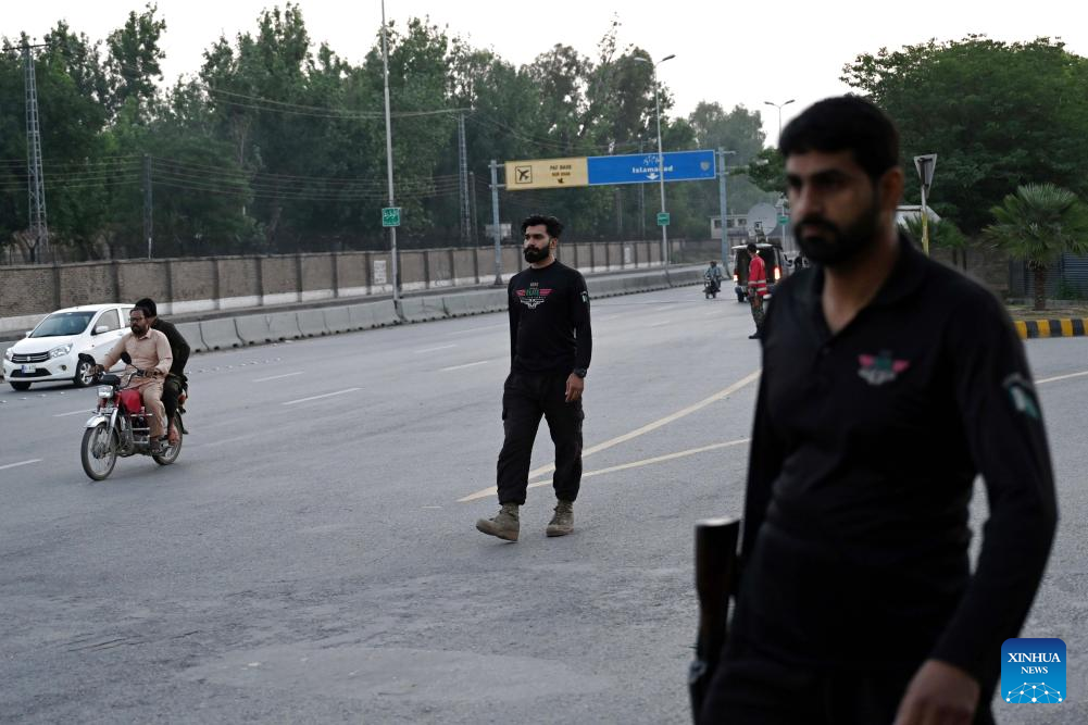 Security personnel patrol on a road leading to Nur Khan Air Base following Indian missile strike in Rawalpindi, Pakistan, May 10, 2025. India launched missile and drone strikes in multiple areas of Pakistan, including three airbases of the Pakistan Air Force (PAF), and also resorted to unprovoked firing along the international border in eastern Punjab province, Pakistani officials and sources confirmed in the wee hours of Saturday. (Xinhua/Ahmad Kamal)