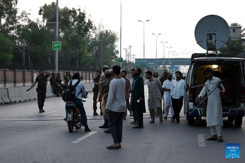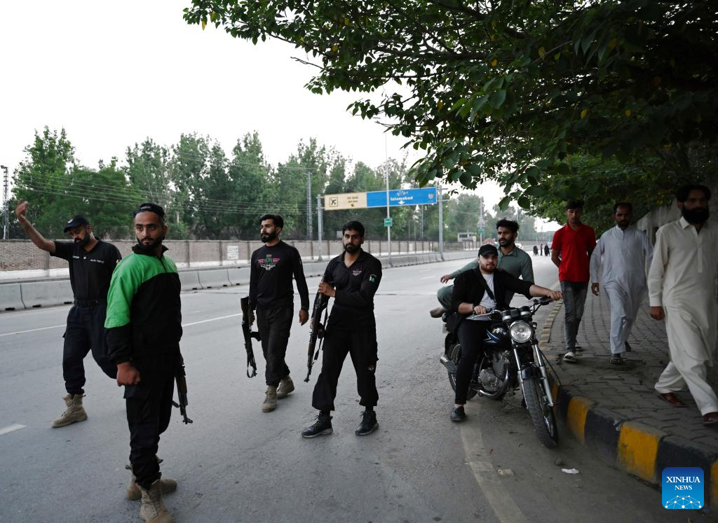 Security personnel stop people on a road leading to Nur Khan Air Base following Indian missile strike in Rawalpindi, Pakistan, May 10, 2025. India launched missile and drone strikes in multiple areas of Pakistan, including three airbases of the Pakistan Air Force (PAF), and also resorted to unprovoked firing along the international border in eastern Punjab province, Pakistani officials and sources confirmed in the wee hours of Saturday. (Xinhua/Ahmad Kamal)