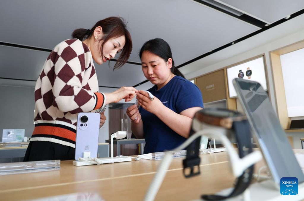 A customer learns about a product at a smart phone store in Yangxin County, east China's Shandong Province, May 10, 2025. China's consumer price index (CPI), a main gauge of inflation, edged down 0.1 percent year on year in April, the National Bureau of Statistics (NBS) said Saturday. Core CPI, which excludes food and energy prices, rose 0.5 percent year on year. (Photo by Chu Baorui/Xinhua)