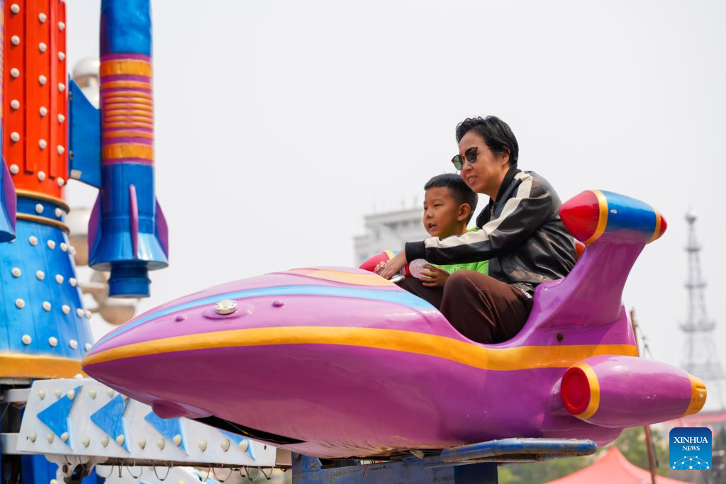 People have fun at an amusement park in the Greater Khingan Range, northeast China's Heilongjiang Province, May 10, 2025. China's consumer price index (CPI), a main gauge of inflation, edged down 0.1 percent year on year in April, the National Bureau of Statistics (NBS) said Saturday. Core CPI, which excludes food and energy prices, rose 0.5 percent year on year. (Photo by Cheng Hongchun/Xinhua)