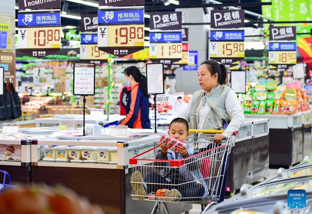 People shop at a supermarket in Zaozhuang City, east China's Shandong Province, May 10, 2025. China's consumer price index (CPI), a main gauge of inflation, edged down 0.1 percent year on year in April, the National Bureau of Statistics (NBS) said Saturday. Core CPI, which excludes food and energy prices, rose 0.5 percent year on year. (Photo by Sun Zhongzhe/Xinhua)