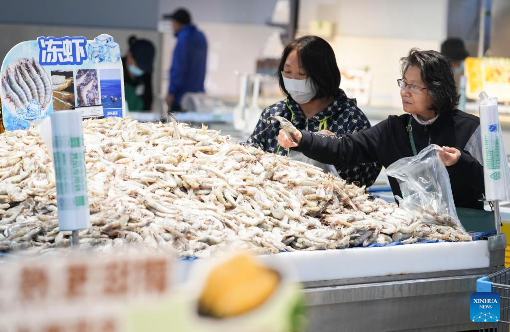 People shop for seafood at a supermarket in Shijiazhuang City, north China's Hebei Province, May 10, 2025. China's consumer price index (CPI), a main gauge of inflation, edged down 0.1 percent year on year in April, the National Bureau of Statistics (NBS) said Saturday. Core CPI, which excludes food and energy prices, rose 0.5 percent year on year. (Photo by Liang Zidong/Xinhua)