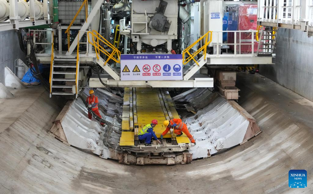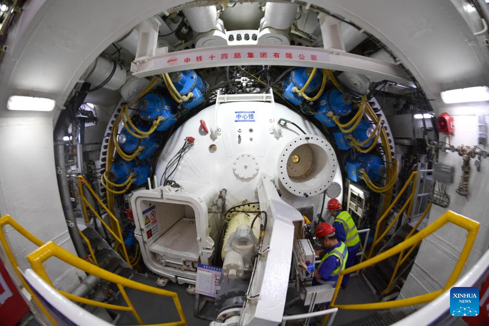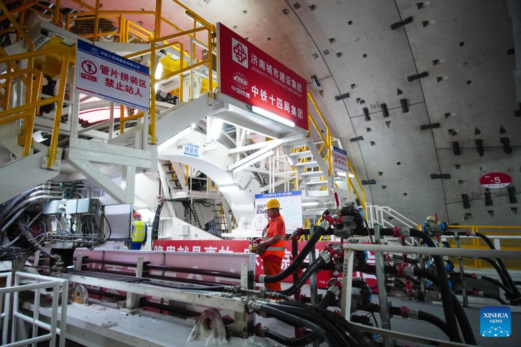 Staff workers work at the construction site of a Yellow River tunnel in Jinan, east China's Shandong Province, May 9, 2025. A shield machine of the south line of the Yellow River tunnel started boring in Jinan on Friday, with an excavation diameter of 15.06 meters.