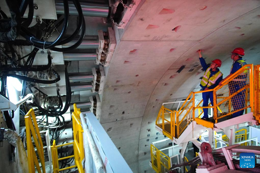 Technical staff conduct inspection inside "Qihang," a tunnel boring machine deployed for the construction of a Yellow River tunnel in Jinan, east China's Shandong Province, May 9, 2025. A shield machine of the south line of the Yellow River tunnel started boring in Jinan on Friday, with an excavation diameter of 15.06 meters.