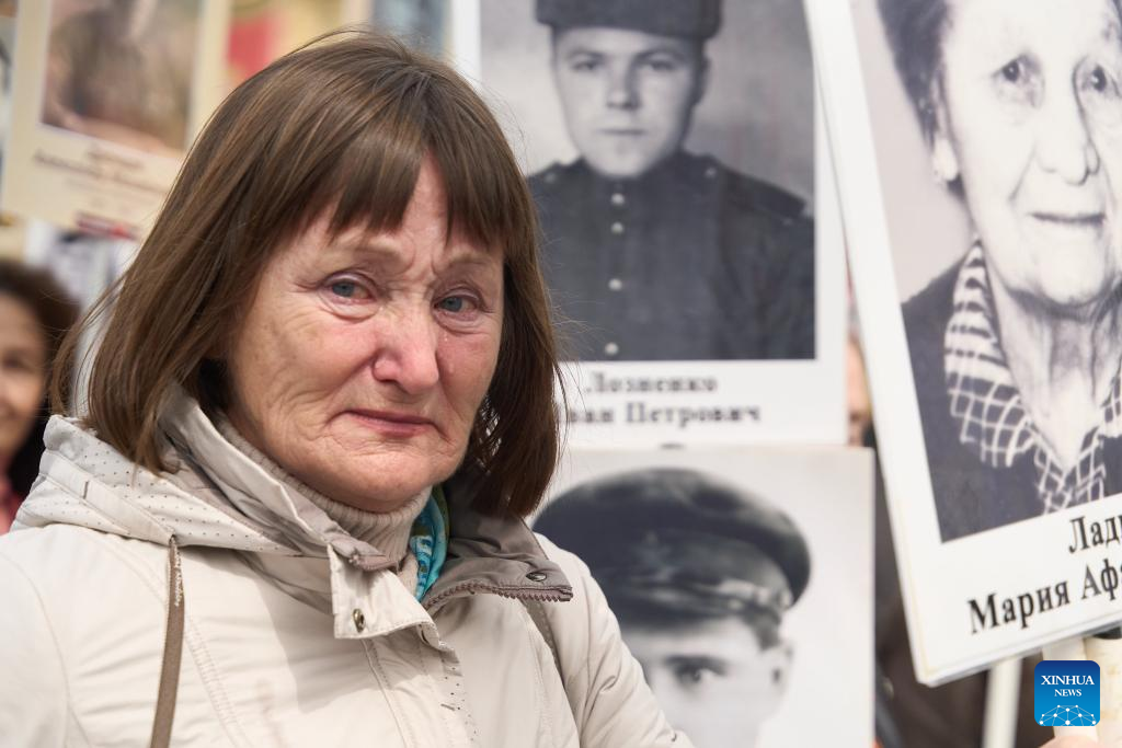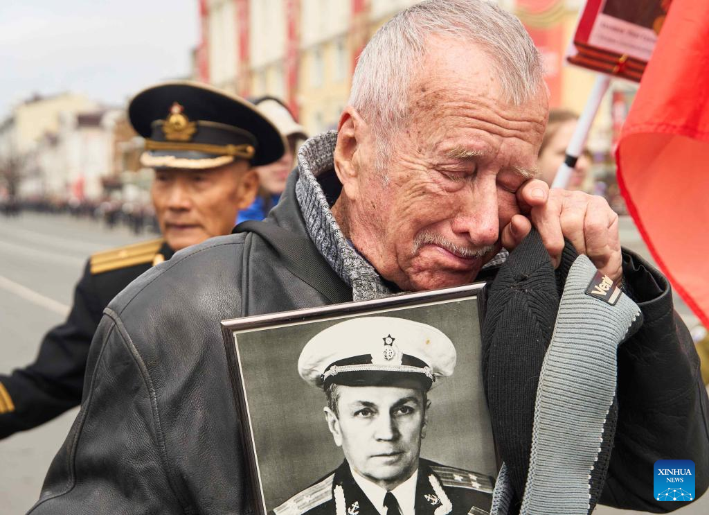 A participant sheds tears during the "Immortal Regiment" parade to commemorate the 80th anniversary of the victory in the Soviet Union's Great Patriotic War in Vladivostok, Russia, May 9, 2025. (Photo by Guo Feizhou/Xinhua)