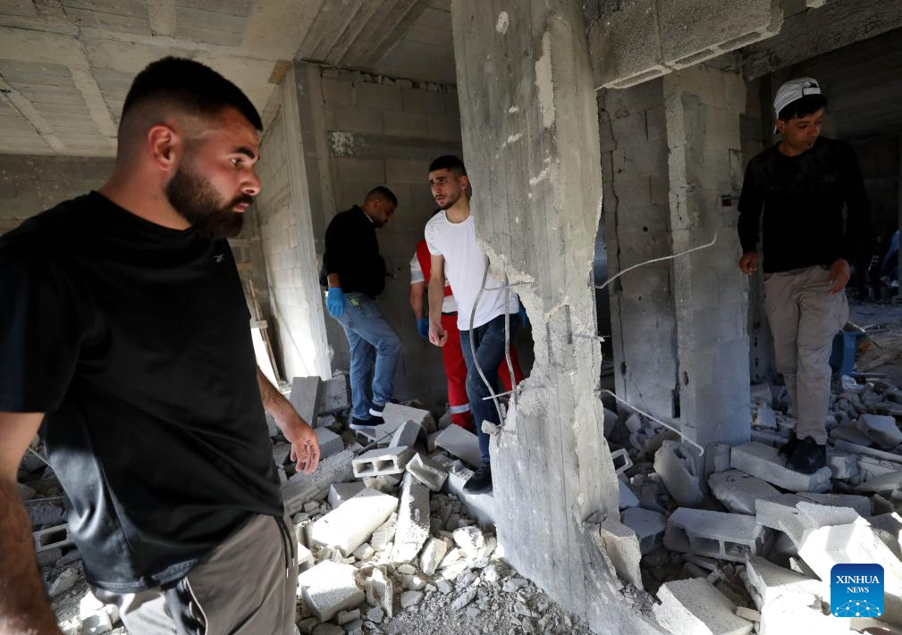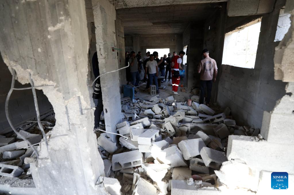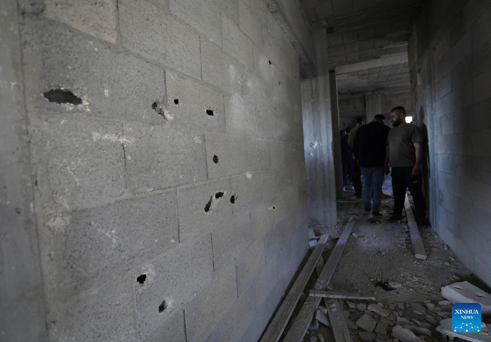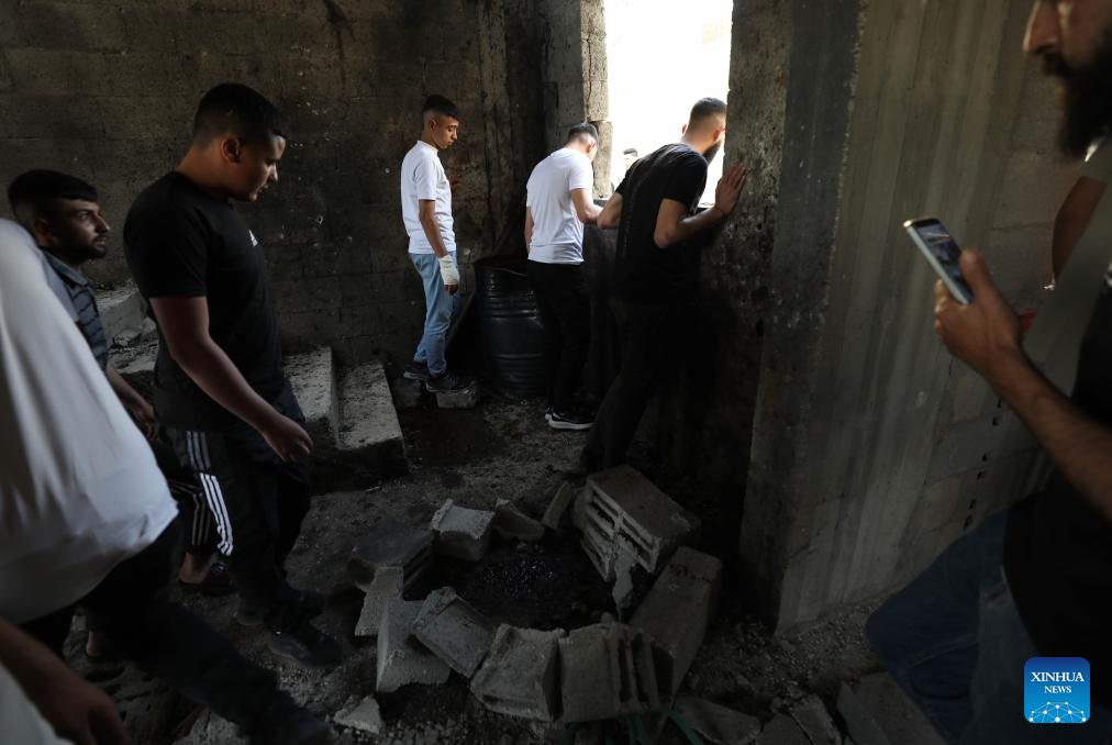 Palestinians check the damage inside a building after an Israeli strike in Nablus, the northern West Bank, on May 9, 2025. Israeli fighters on Friday killed the head of the Islamic Jihad movement in Jenin, northern West Bank, the Israel Defense Forces (IDF) and Israel Police said in a joint statement. The statement added that he was located and killed in Nablus city in a joint operation by the IDF, Israel Police's National Counter Terror Unit, and the Israel Security Agency, or the Shin Bet. (Photo by Ayman Nobani/Xinhua)