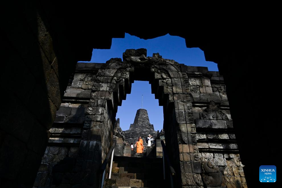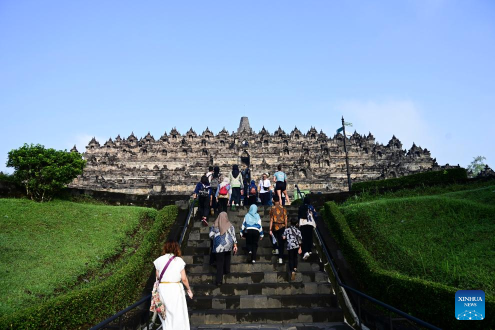 People visit the Borobudur Temple, a UNESCO-listed world heritage site, in Magelang, Central Java, Indonesia, May 10, 2025. (Xinhua/Zulkarnain)