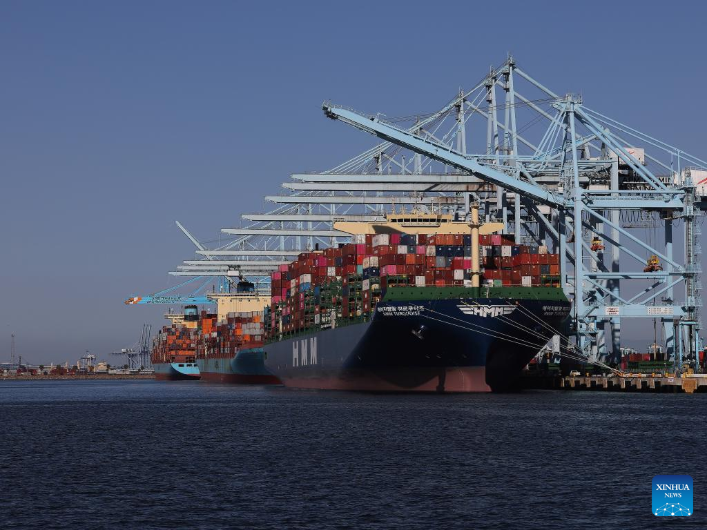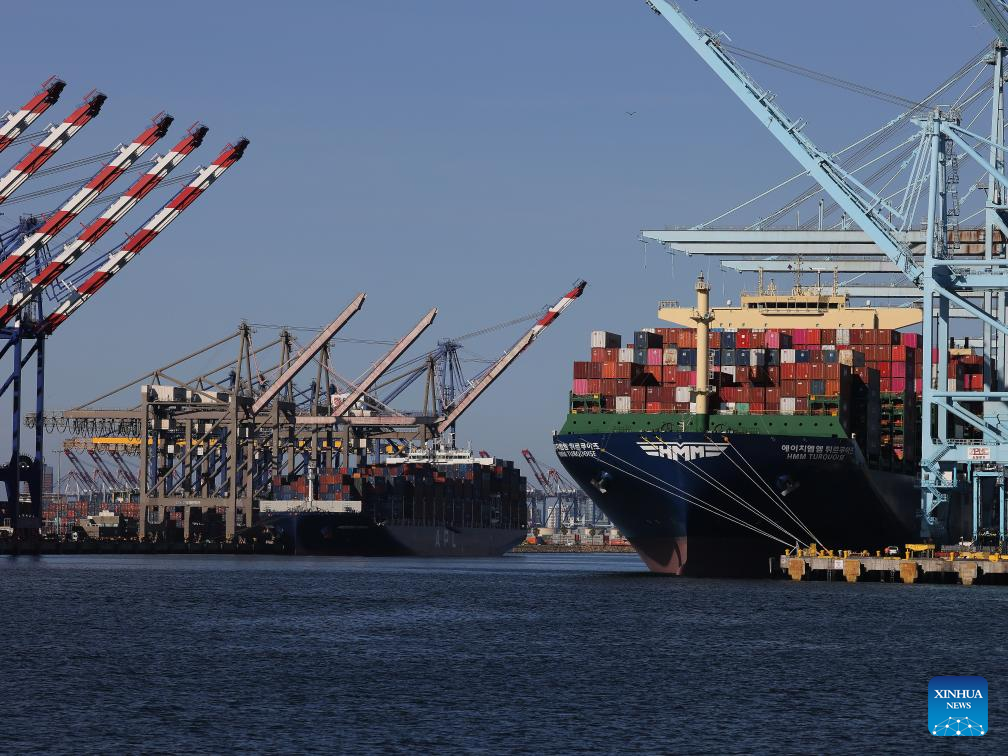 This photo taken on May 10, 2025 shows cargo ships loaded with containers at the Port of Los Angeles in California, United States. In a recent advertisement, California Governor Gavin Newsom warned the American public of the "real" and "serious" consequences of recent high tariffs, describing the situation as a "code red" economic emergency. (Photo by Qiu Chen/Xinhua)