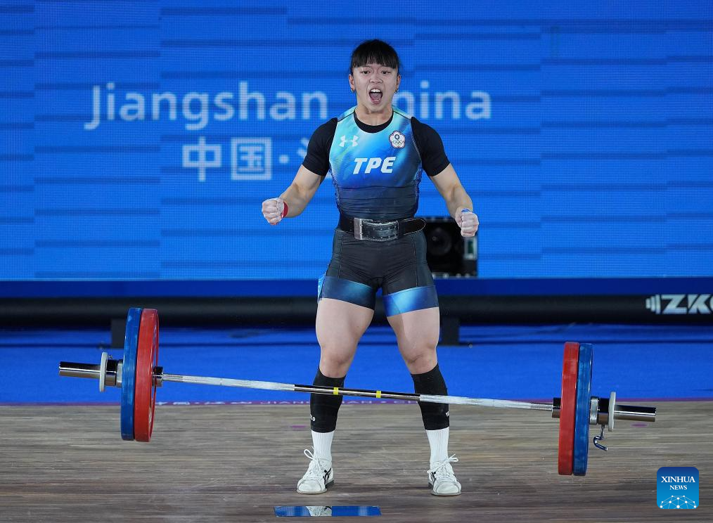 Hu Chia Chi of Chinese Taipei competes during the women's 55kg competition at 2025 Asian Weightlifting Championships in Jiangshan, east China's Zhejiang Province, May 10, 2025. (Xinhua/Hou Zhaokang)