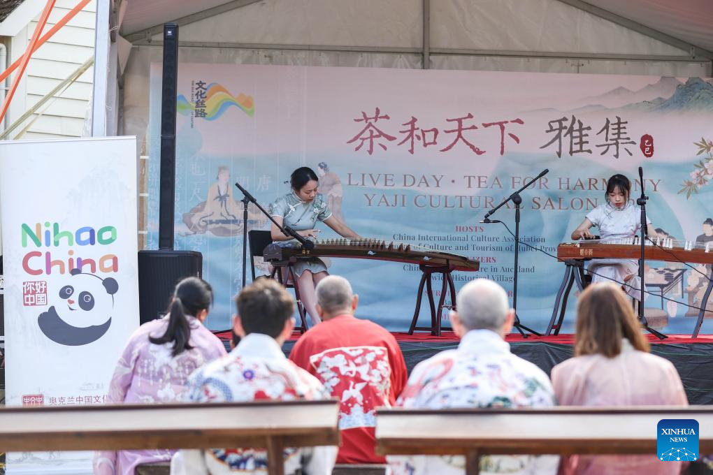 People enjoy Chinese folk music during the "Tea for Harmony" cultural salon in Auckland, New Zealand, May 11, 2025. The cultural salon on tea was held on Sunday at the picturesque Howick Historical Village in New Zealand's largest city Auckland, inviting guests and local residents to immerse themselves in the richness of traditional Chinese culture while promoting dialogue and friendship between China and New Zealand. (Xinhua/Long Lei)