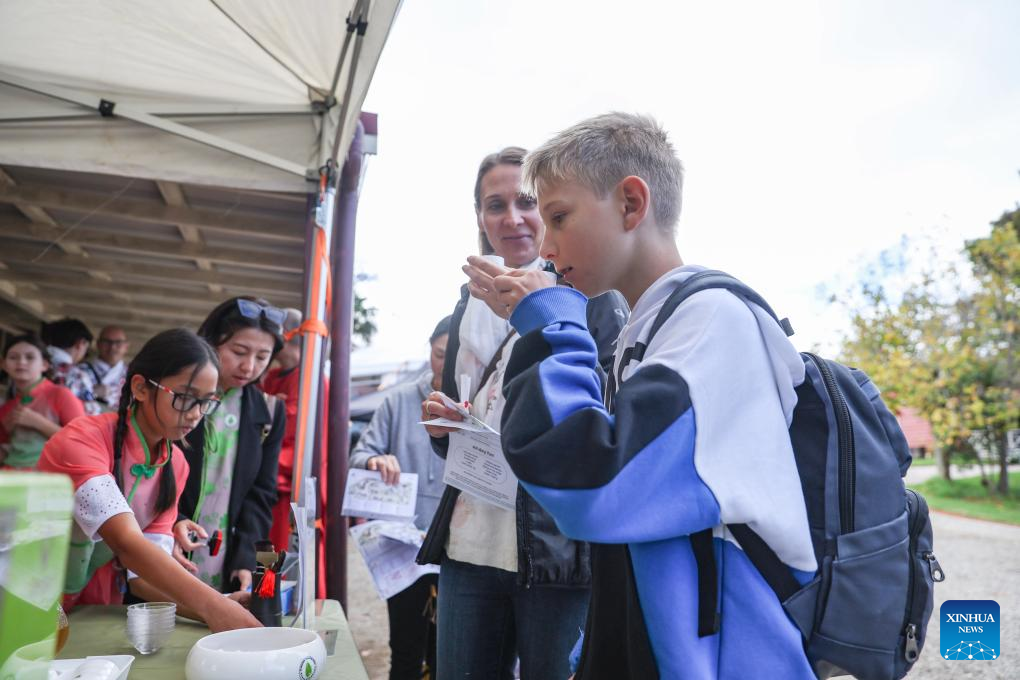 People try Chinese tea during the "Tea for Harmony" cultural salon in Auckland, New Zealand, May 11, 2025. The cultural salon on tea was held on Sunday at the picturesque Howick Historical Village in New Zealand's largest city Auckland, inviting guests and local residents to immerse themselves in the richness of traditional Chinese culture while promoting dialogue and friendship between China and New Zealand. (Xinhua/Long Lei)