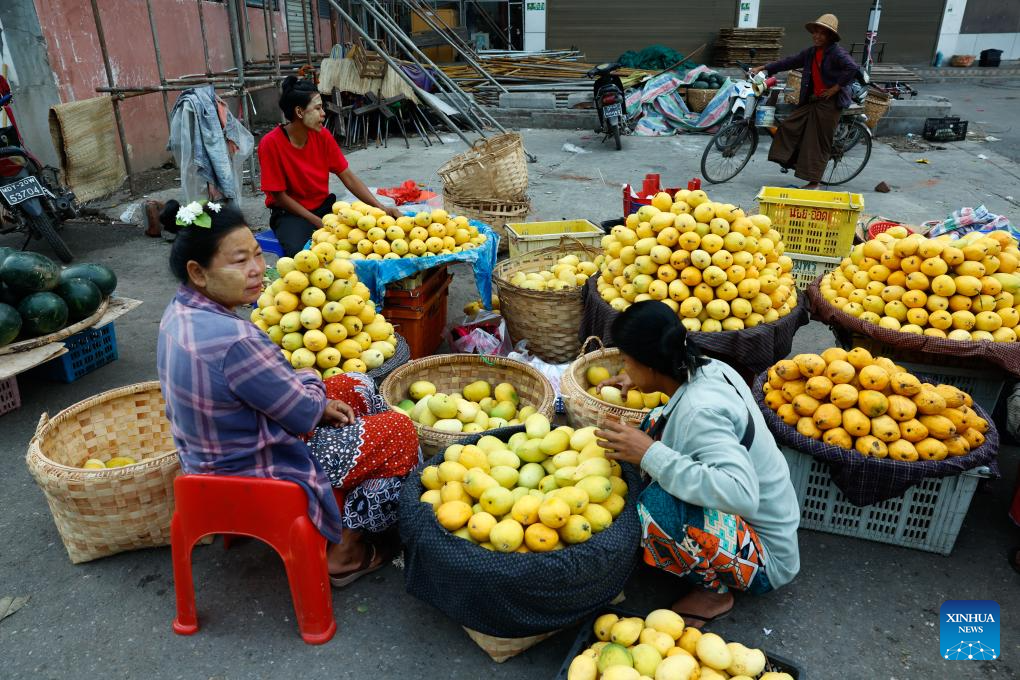 Vendors sell mangoes at a local market in Mandalay, Myanmar, May 11, 2025. (Xinhua/Myo Kyaw Soe)