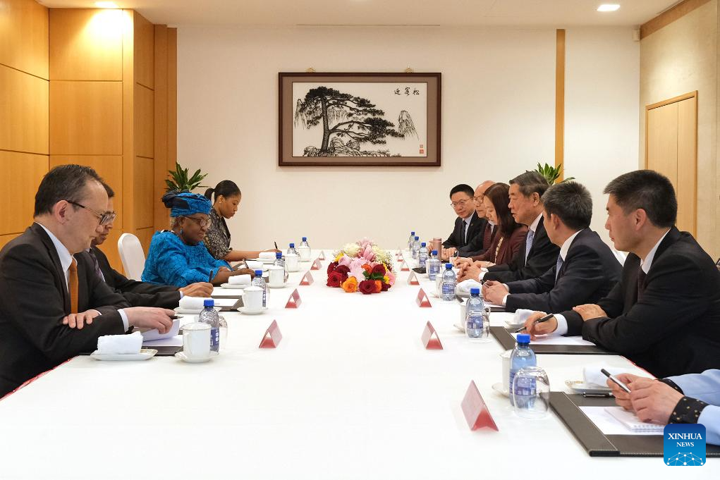 Chinese Vice Premier He Lifeng meets with World Trade Organization (WTO) Director-General Ngozi Okonjo-Iweala in Geneva, Switzerland, May 11, 2025. (Xinhua/Wang Yanan)