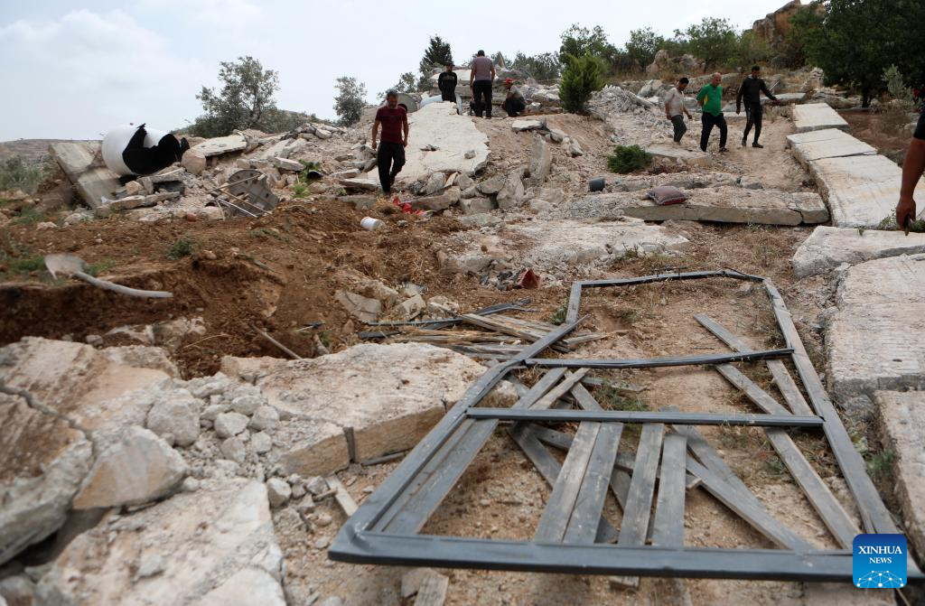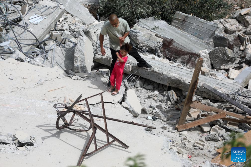 Palestinians are seen among rubble after Israeli excavators demolished a house in the village of Idna, west of the West Bank city of Hebron, May 12, 2025. (Photo by Mamoun Wazwaz/Xinhua)