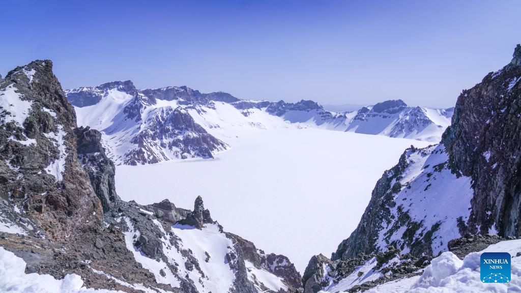 This photo taken on April 23, 2025 shows Tianchi crater lake on Changbai Mountains in northeast China's Jilin Province. (Xinhua/Wang Fan)