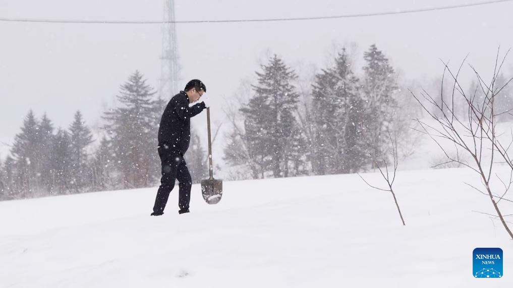 This photo taken on April 25, 2025 shows Zhong Guangpei, an engineer at the Tianchi crater lake volcanic monitoring station, walking to a monitor spot on Changbai Mountains in northeast China's Jilin Province. (Xinhua/Zhang Wenrong)