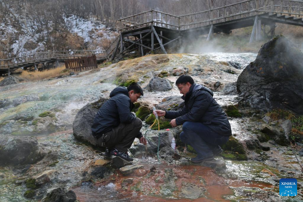 This undated photo shows Kong Qingjun (L), head of the Tianchi crater lake volcanic monitoring station, and his colleague taking a sample of hot spring gas on Changbai Mountains in northeast China's Jilin Province. (Xinhua)