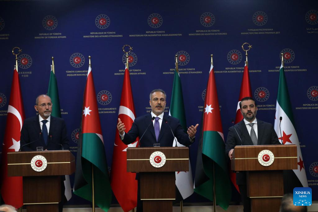 Turkish Foreign Minister Hakan Fidan (C), Jordanian Foreign Minister Ayman Safadi (L) and Syria's foreign affairs chief Asaad al-Shibani attend a joint press conference in Ankara, Türkiye, on May 12, 2025. During a joint press conference on Monday in Ankara with his Syrian and Jordanian counterparts, Fidan noted that discussions are still ongoing regarding the modalities of the peace negotiations between Russia and Ukraine. (Mustafa Kaya/Handout via Xinhua)