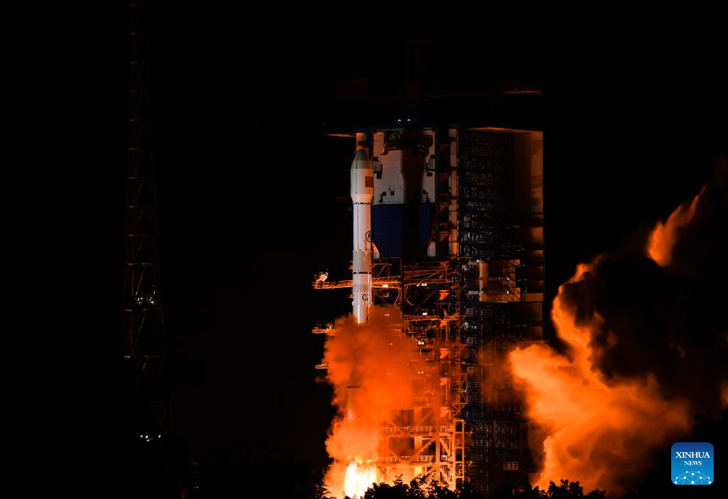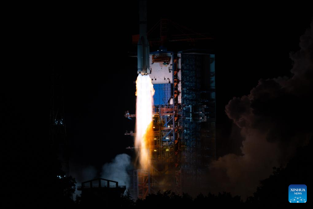 A Long March-3C rocket carrying a new communication technology test satellite blasts off from the Xichang Satellite Launch Center in southwest China's Sichuan Province, May 13, 2025. Launched at 2:09 a.m. (Beijing Time) aboard a Long March-3C rocket, the satellite has entered its planned orbit successfully, the launch center said. (Photo by Yang Xi/Xinhua)