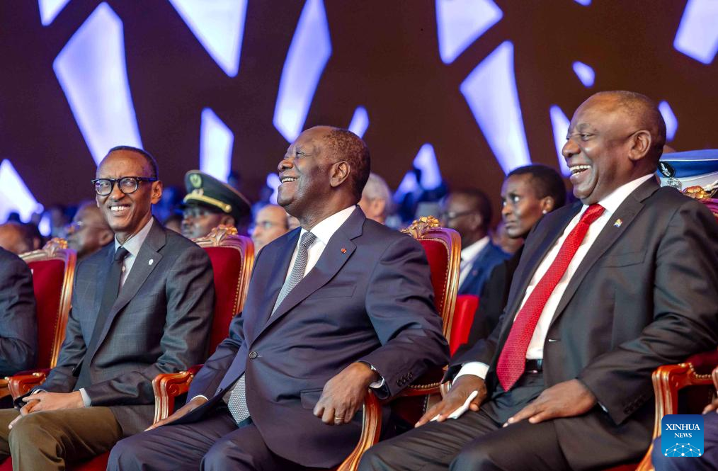 Rwandan President Paul Kagame (L), Ivorian President Alassane Ouattara (C) and South African President Cyril Ramaphosa attend the opening ceremony of the 12th edition of the Africa CEO Forum in Abidjan, Cote d'Ivoire, May 12, 2025. The 12th edition of the Africa CEO Forum opened on Monday in Abidjan, under the theme "Can a New Deal Between the State and Private Sector Deliver the Continent a Winning Hand?" (Photo by Yvan Sonh/Xinhua)