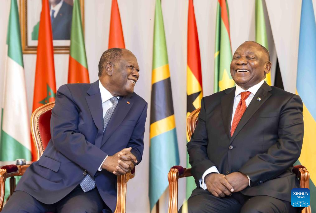 Ivorian President Alassane Ouattara (L) meets with South African President Cyril Ramaphosa during the opening ceremony of the 12th edition of the Africa CEO Forum in Abidjan, Cote d'Ivoire, May 12, 2025. The 12th edition of the Africa CEO Forum opened on Monday in Abidjan, under the theme "Can a New Deal Between the State and Private Sector Deliver the Continent a Winning Hand?" (Photo by Yvan Sonh/Xinhua)