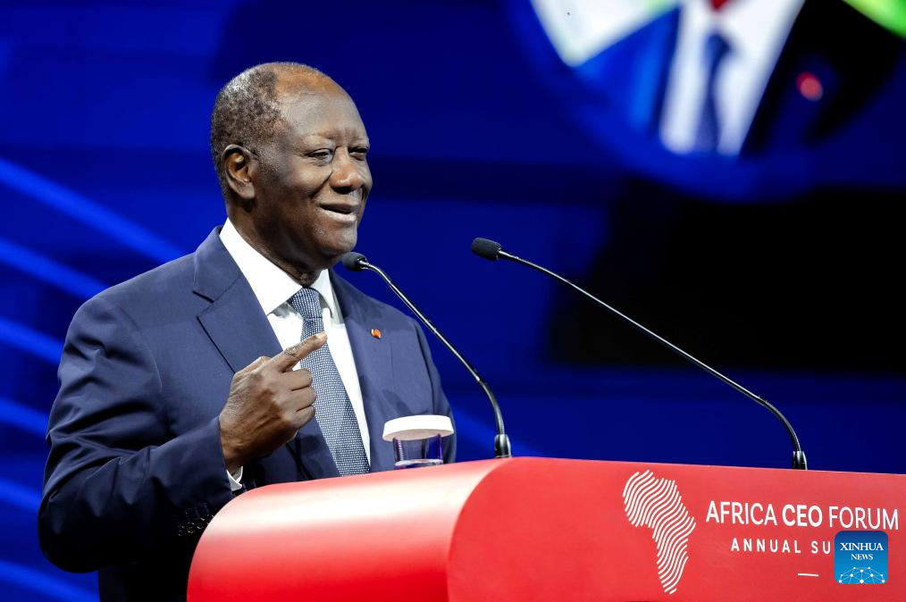 Ivorian President Alassane Ouattara speaks during a presidential panel at the opening ceremony of the 12th edition of the Africa CEO Forum in Abidjan, Cote d'Ivoire, May 12, 2025. The 12th edition of the Africa CEO Forum opened on Monday in Abidjan, under the theme "Can a New Deal Between the State and Private Sector Deliver the Continent a Winning Hand?" (Photo by Yvan Sonh/Xinhua)