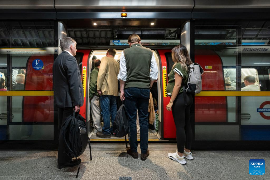 Commuters board a crowded Jubilee line tube at Westminster station in London, Britain, on May 12, 2025. A power outage struck the London Underground, causing widespread travel disruptions across the capital on Monday afternoon, Transport for London (TfL) confirmed. (Photo by Stephen Chung/Xinhua)