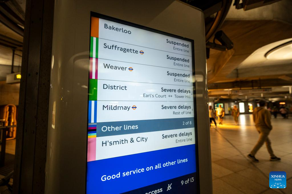 An information screen at Westminster station shows suspended tube lines and severe delays on others in London, Britain, on May 12, 2025. A power outage struck the London Underground, causing widespread travel disruptions across the capital on Monday afternoon, Transport for London (TfL) confirmed. (Photo by Stephen Chung/Xinhua)