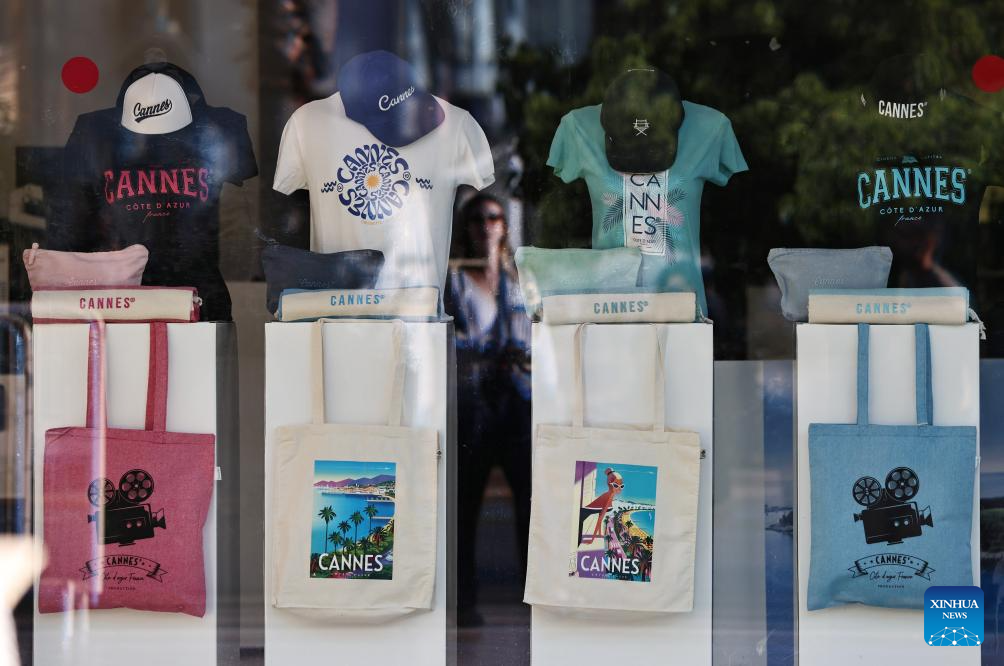 This photo taken on May 12, 2025 shows the Cannes International Film Festival-themed souvenirs displayed inside a show window in Cannes, southern France. The 78th Cannes International Film Festival runs from May 13 to 24. (Xinhua/Gao Jing)